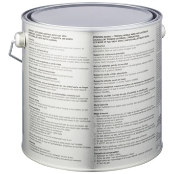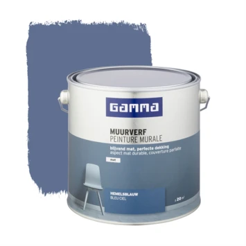 De GAMMA muurverf voor binnenshuis is geschikt voor het schilderen van muren en plafonds. De GAMMA muurverf hemelsblauw 2,5 L is een geur arme watergedragen muurverf. Het blik heeft een inhoud van 2,5 liter, dit is voldoende voor een oppervlakte van ongeveer 20 m². Twee uur na het aanbrengen van de verf is deze reeds stofdroog, na 6 uur kan je de volgende laag aanbrengen. De beste temperatuur om met deze verf te werken is tussen de 8 en 25°C. Met zijn uitstekende dekking is de verf zeer geschikt als afwerklaag op verschillende ondergronden, waaronder cement- en pleisterwerk, gipsplaat, glasweefsel, beton en behang.