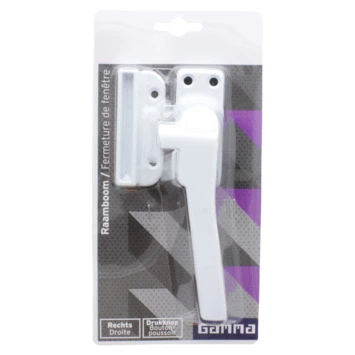 Met de GAMMA raamsluiting kun je gemakkelijk een naar buiten draaiend raam afsluiten. Deze raamsluiting is geschikt voor naar rechts draaiende ramen en door de drukknop is de raamboom extra stevig vergrendeld. Tevens beschikt deze raamsluiting over een nok zodat het raam veilig op de ventilatiestand gezet kan worden. Deze raamsluiting is gemaakt van een stevige metaallegering (zamak) waardoor deze extra stevig is. De raamboom wordt geleverd inclusief de bijbehorende sluitplaat. De kleur van de raamsluiting is wit.