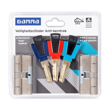 GAMMA veiligheidscilinder gelijksluitend nikkel 2 stuks heeft 3 SKG sterren en politie keurmerk, incl. kerntrekbeveiliging per 2 stuks gelijksluitend. Andere maten kunt u in de bouwmarkt (bij) bestellen. Ook sleutels kunt u (bij) bestellen. Neem uw unieke code kaart mee..