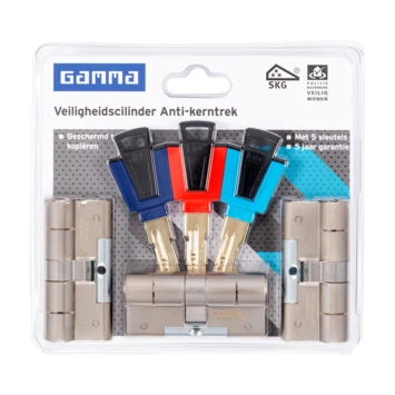 GAMMA veiligheidscilinder gelijksluitend SKG*** 3 SKG sterren en politie keurmerk, incl. kerntrekbeveiliging per 3 stuks gelijksluitend. Andere maten kunt u in de bouwmarkt (bij) bestellen. Ook sleutels kunt u (bij) bestellen. Neem uw unieke code kaart mee..